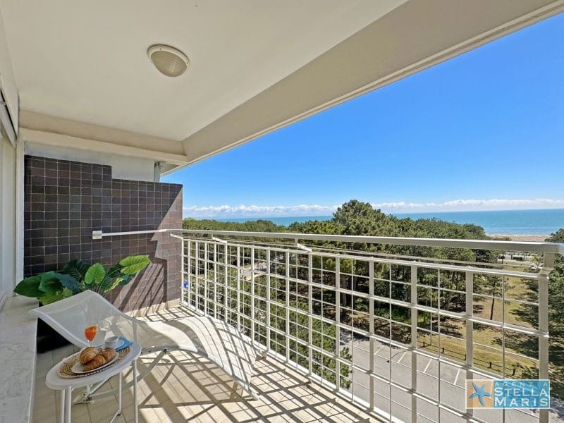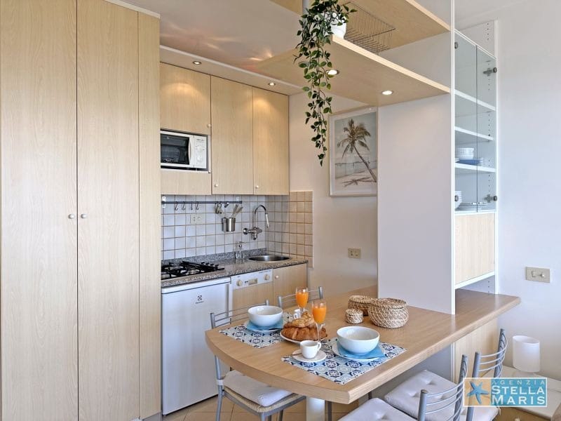 Ariston Palace in Lignano Pineta, nur 50 Meter vom Strand entfernt. Helles Studio-Apartment mit Kochnische, Doppelschlafsofa, Bad und Terrasse mit herrlichem Meerblick. 4. Etage. Fernseher, Geschirrspüler und Klimaanlage. Ruhige Lage, Barren, Restaurants, Supermarkt und diverse Geschäfte sind fußläufig erreichbar.